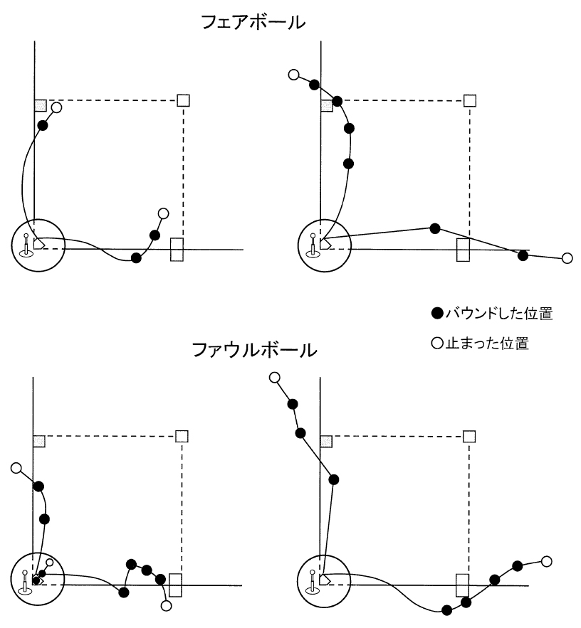 ここに打球が飛ぶと『 フェアボール 』です。 ろんどべる 上の画像の暗い部分に飛んだ打球が『 ファウルボール 』になります。 ファウルボールの注意点 ・ファウルボールと判定された場合、ストライクのカウントが1つ増えます。 (2ストライクまで5、フェア、ファウル 「ファウルボール」 マスクを外してコールすることが望ましい。 フェアかファウルか際どい場合はジェスチャーを大きく。 ライン際の打球 ※まずフェアかファウルの判定を出す。ポイントする。